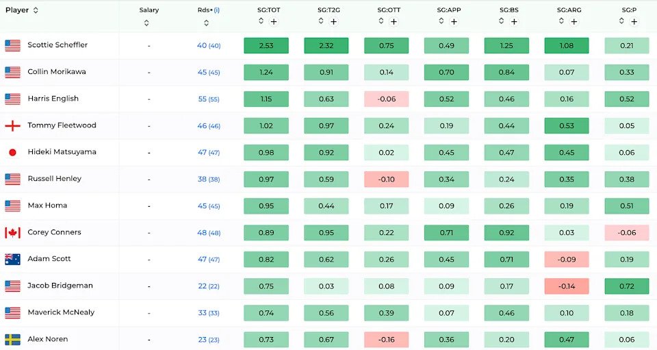 Long, difficult courses are the comps if you’re looking. Which should result in a Major level winner this week. Here are the best players, per round between Augusta, Torrey Pines (South), Riviera, Quail Hollow, and Bay Hill over the past three years.