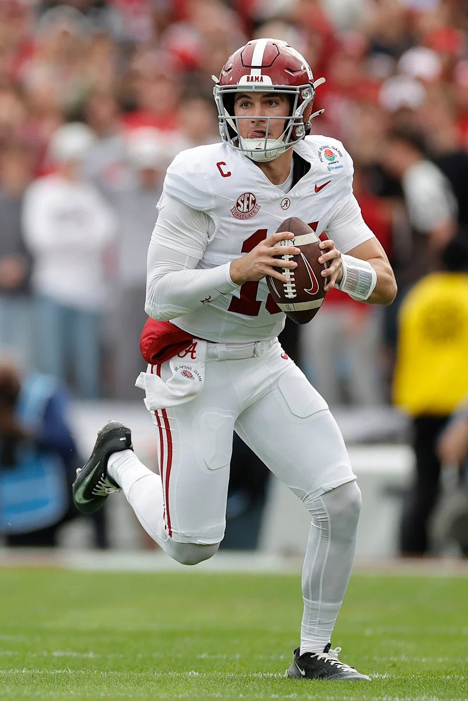 Ty Simpson of the Alabama Crimson Tide scrambles during the first quarter against the Indiana Hoosiers in the College Football Playoff Quarterfinal at Rose Bowl Stadium on January 01, 2026, in Pasadena, California.