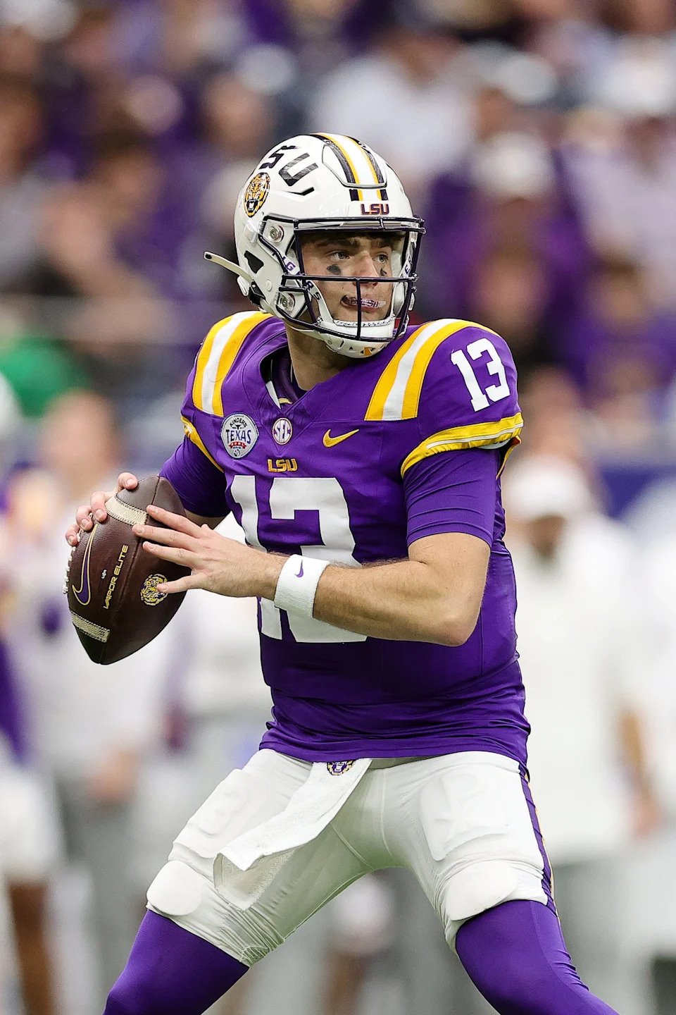 Garrett Nussmeier of the LSU Tigers drops back to pass against the Baylor Bears during the first half in the Kinder’s Texas Bowl at NRG Stadium on December 31, 2024, in Houston, Texas.