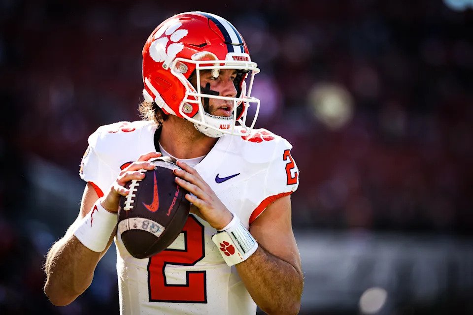 Cade Klubnik of the Clemson Tigers warms up during the first half of a football game against the South Carolina Gamecocks at Williams-Brice Stadium on November 29, 2025, in Columbia, South Carolina.