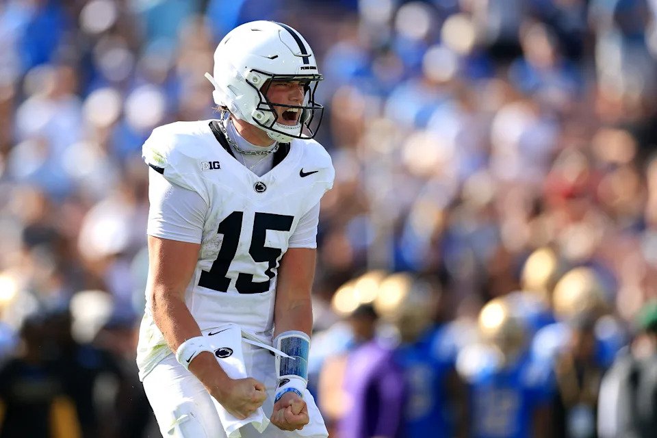 Drew Allar of the Penn State Nittany Lions reacts after a touchdown against the UCLA Bruins during the fourth quarter at Rose Bowl Stadium on October 04, 2025, in Pasadena, California.