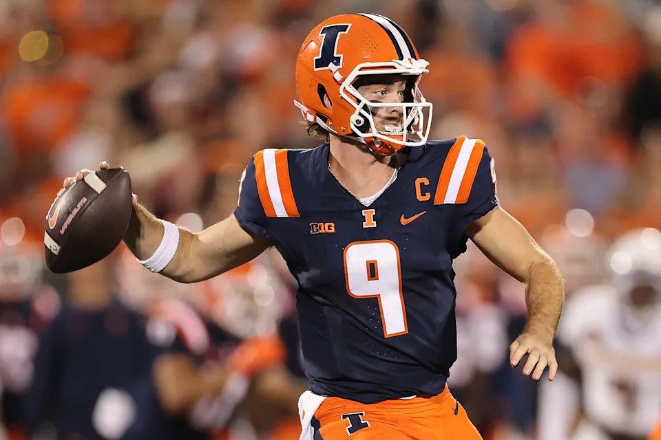 Luke Altmyer of the Illinois Fighting Illini throws a pass against the Western Illinois Leathernecks during the first half at Memorial Stadium on August 29, 2025, in Champaign, Illinois.