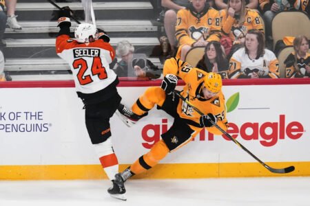PITTSBURGH, PENNSYLVANIA – MAY 09: Fans walk by a Pittsburgh Penguins Stanley Cup Playoff puck outside of PPG PAINTS Arena before Game Four of the First Round of the 2022 Stanley Cup Playoffs between the Pittsburgh Penguins and New York Rangers on May 09, 2022 in Pittsburgh, Pennsylvania. (Photo by Emilee Chinn/Getty Images) | Getty Images