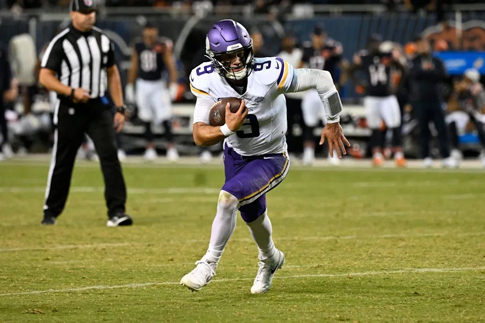 Minnesota Vikings quarterback J.J. McCarthy runs with the ball during the fourth quarter of the game against the Chicago Bears at Soldier Field on Sept. 8, 2025, in Chicago. Minnesota won, 27-24, in McCarthy’s NFL debut.