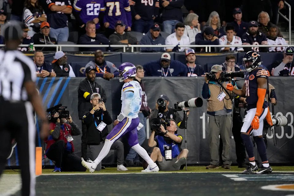 Minnesota Vikings quarterback J.J. McCarthy runs into the end zone for a touchdown during the fourth quarter of the game against the Chicago Bears at Soldier Field on Sept. 8, 2025, in Chicago. Minnesota won, 27-24, in McCarthy’s NFL debut.