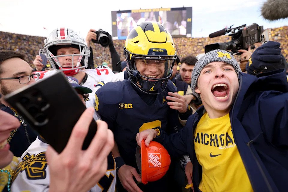 J.J. McCarthy of the Michigan Wolverines celebrates with fans on the field after defeating the Ohio State Buckeyes at Michigan Stadium on Nov. 25, 2023, in Ann Arbor, Michigan.
