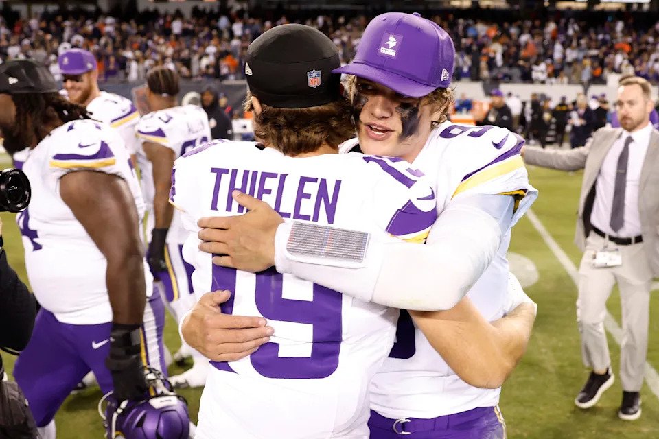 Minnesota Vikings quarterback J.J. McCarthy hugs wide receiver Adam Thielen after defeating the Chicago Bears, 27-24, at Soldier Field on Sept. 8, 2025, in Chicago.