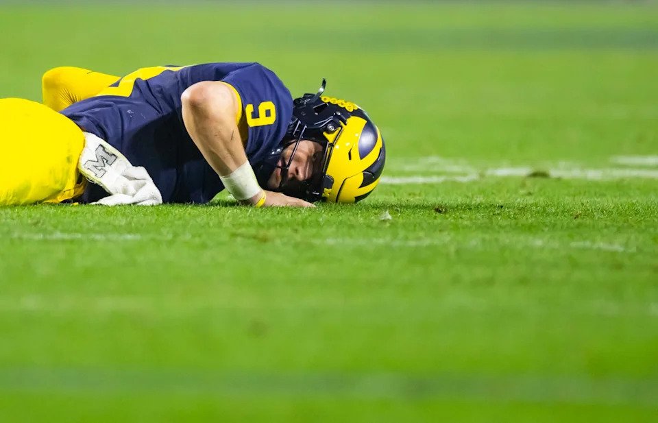Michigan Wolverines quarterback J.J. McCarthy meditates in the end zone before the game against the Michigan State Spartans on Saturday, Oct. 29, 2022.