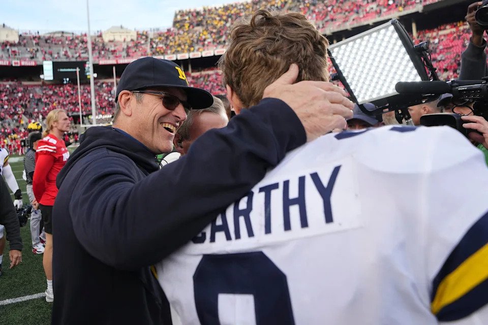 Michigan Wolverines head coach Jim Harbaugh hugs quarterback J.J. McCarthy following their 45-23 win over the Ohio State Buckeyes in the NCAA football game at Ohio Stadium on Nov. 26, 2022.