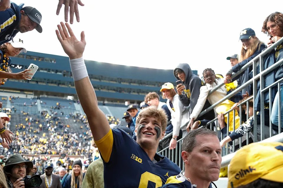 Michigan quarterback J.J. McCarthy high-fives fans after the Wolverines defeated Maryland, 34-27, at Michigan Stadium on Saturday, Sept. 24, 2022.