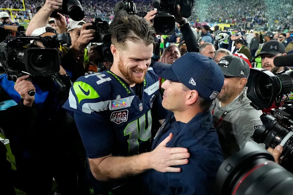Seattle Seahawks head coach Mike MacDonald celebrates with quarterback Sam Darnold after defeating the New England Patriots in Super Bowl LX at Levi’s Stadium.