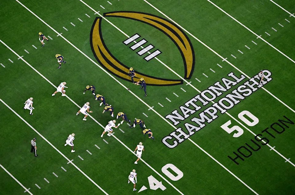 J.J. McCarthy of the Michigan Wolverines calls a play in the first quarter against the Washington Huskies during the 2024 College Football Playoff national championship game at NRG Stadium on Jan. 8, 2024, in Houston.