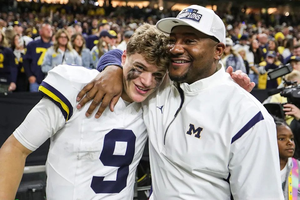 Michigan quarterback J.J. McCarthy and wide receivers coach Ron Bellamy celebrate Michigan’s 26-0 win over Iowa in the Big Ten championship game in Indianapolis on Saturday, Dec. 2, 2023.