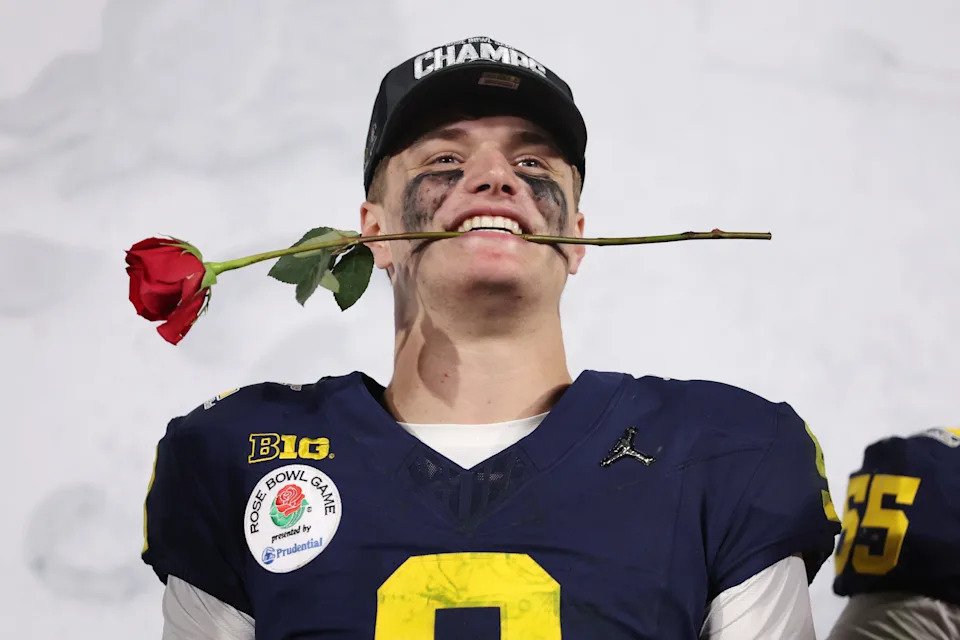 J.J. McCarthy of the Michigan Wolverines celebrates with a rose after beating the Alabama Crimson Tide, 27-20, in overtime to win the College Football Playoff Rose Bowl game on Jan. 1, 2024, in Pasadena, California.