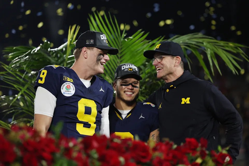 J.J. McCarthy of the Michigan Wolverines celebrates with teammate Blake Corum and head coach Jim Harbaugh after beating the Alabama Crimson Tide, 27-20, in overtime to win the College Football Playoff Rose Bowl game on Jan. 1, 2024, in Pasadena, California.