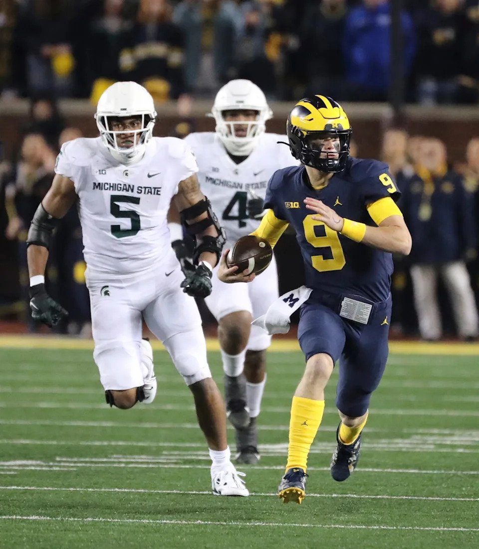 Michigan quarterback J.J. McCarthy runs by Michigan State defensive end Michael Fletcher during the first half on Saturday, Oct. 29, 2022.