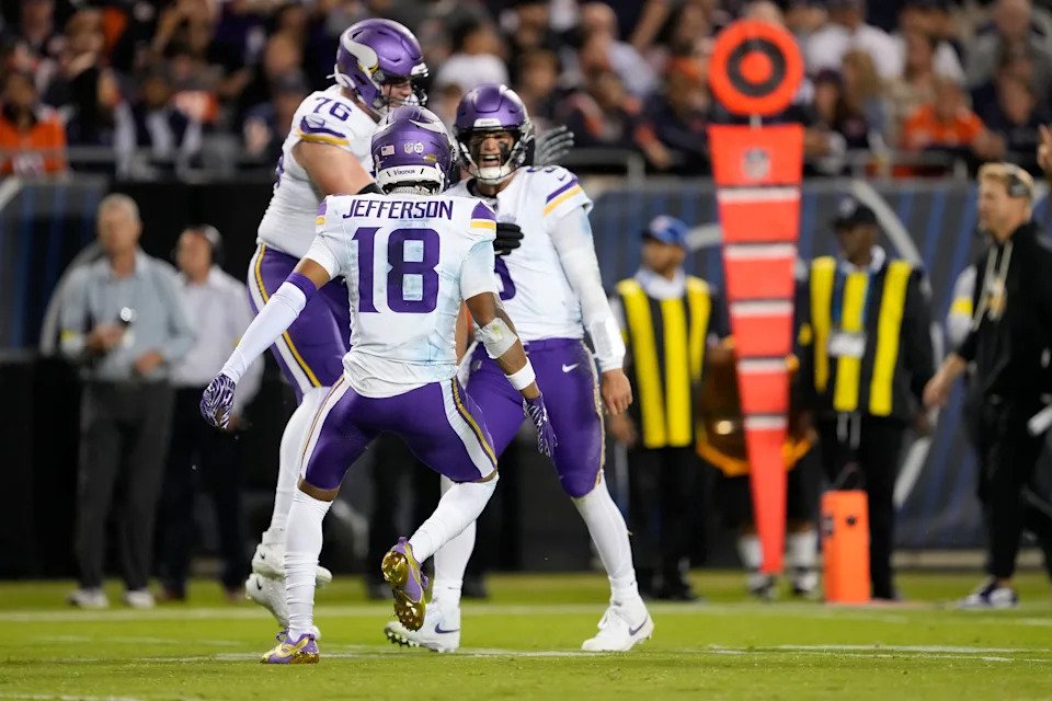 J.J. McCarthy, Brian O’Neill and Justin Jefferson of the Minnesota Vikings celebrate after scoring a touchdown in the fourth quarter against the Chicago Bears at Soldier Field on Sept. 8, 2025, in Chicago. Minnesota won, 27-24, in McCarthy’s NFL debut.