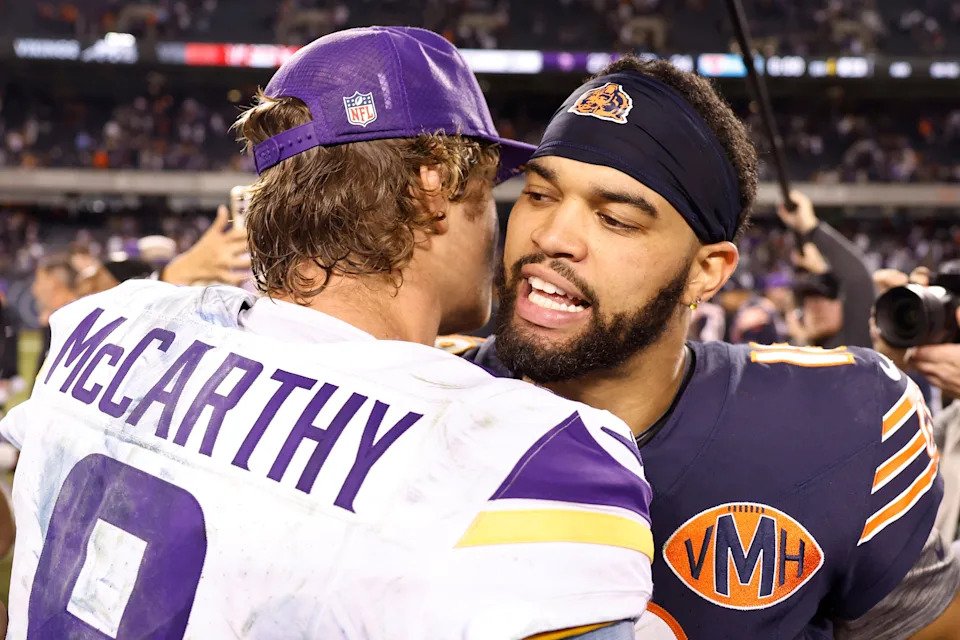 Minnesota Vikings quarterback J.J. McCarthy shakes hands with Chicago Bears quarterback Caleb Williams after the game at Soldier Field on Sept. 8, 2025, in Chicago. Minnesota won, 27-24, in McCarthy’s NFL debut.