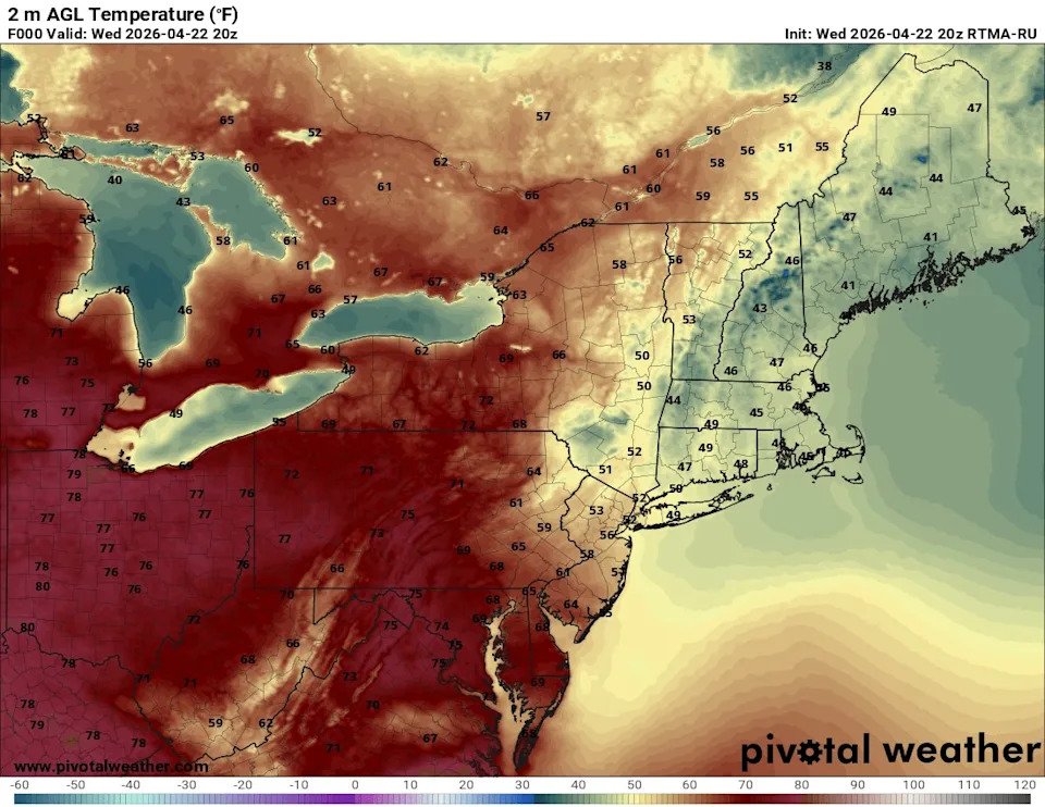Lastly, I think it’s worth discussing what makes Fenway’s early season cold unique and why it may provide a better litmus test of which teams have the most moxie compared to pretty much any other location. Sure, it’s a northern city, which is probably the first direction that comes to mind when thinking about cold air, but what really separates Fenway in this conversation from all the other ballparks is that it’s so far to the east. This means it both sticks out into the ocean, and is on the front lines when the wind has any inkling of blowing off it. Just take a look at the temperatures yesterday when the wind was out of the south and notice how New England is the only area in the northeast and Great Lakes that didn’t benefit from that.