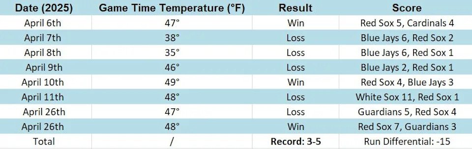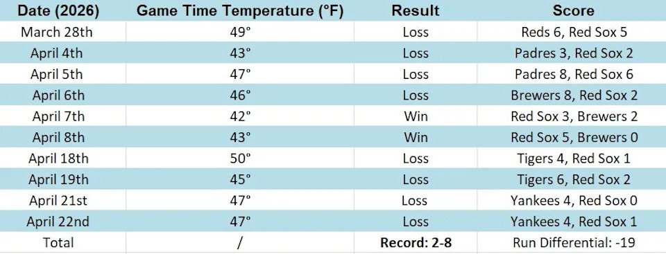(Eagle eyed readers might notice I’m actually missing a game from the 2026 sample, and that’s the exception I mentioned above. Technically, the Marathon Monday match up belongs on this list with a first pitch temperature of 47 degrees, but I removed it because with the 11am start time, temperatures were actually rising through the 50s as the game progressed. In other words, it’s not comparable to your 1:30pm afternoon starts where the first pitch temperature will be close to the high for the day; and it’s the exact opposite of your evening April starts where it will keep getting colder as the game goes on. So for the spirit of this exercise, I dropped it from the analysis.)