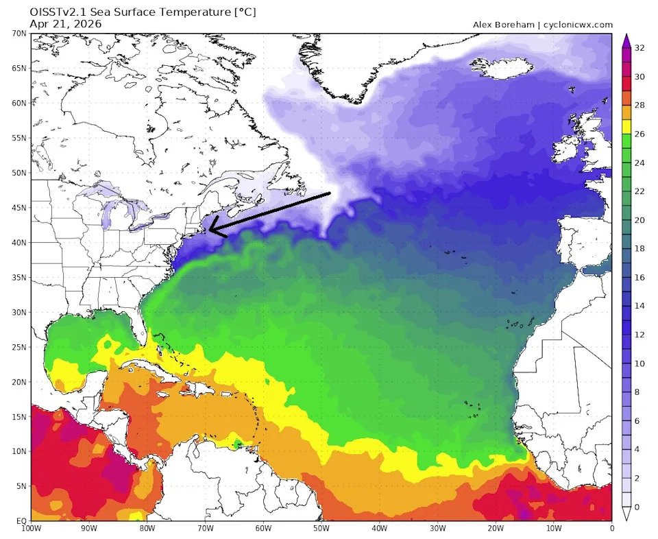 As it turns out, that same Labrador Current that comes down from the Arctic and sends icebergs down the east side of Canada’s waters ends up turning west before flowing in the Gulf of Maine, where it waits for the chance to blow into Fenway Park before things warm up later in spring.