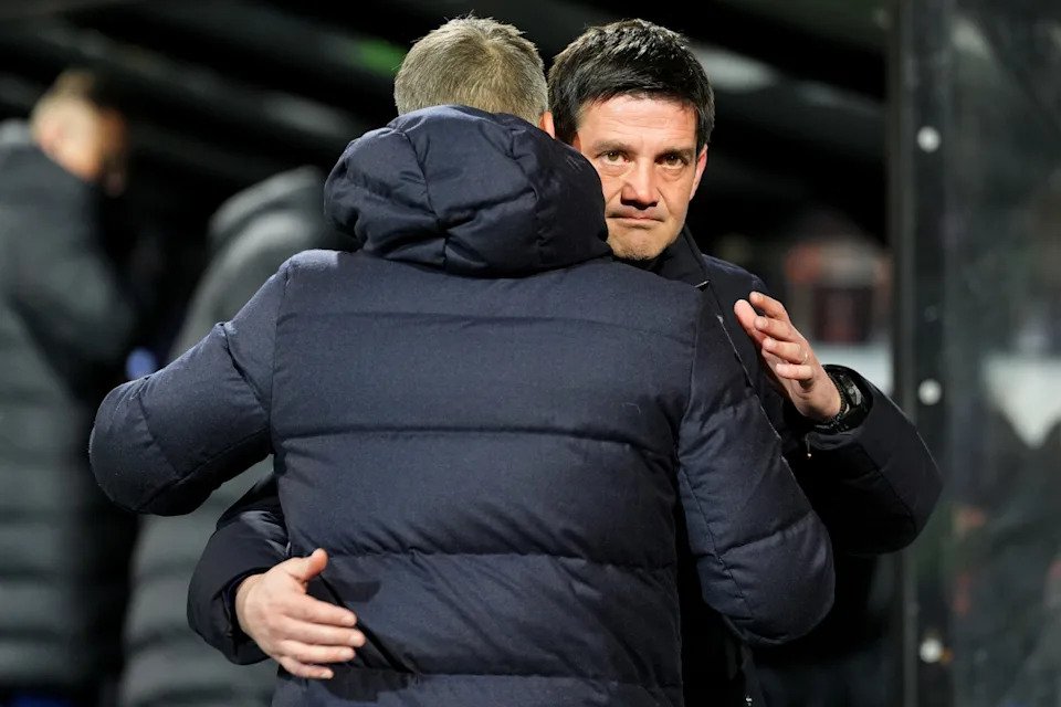 BODO, NORWAY – FEBRUARY 18: Cristian Chivu, Head Coach of FC Internazionale Milano, interacts with Kjetil Knutsen, Head Coach of Bodo/Glimt, prior to the UEFA Champions League 2025/26 League Knockout Play-off First Leg match between FK Bodo/Glimt and FC Internazionale Milano at Aspmyra Stadion on February 18, 2026 in Bodo, Norway. (Photo by Martin Ole Wold/Getty Images)