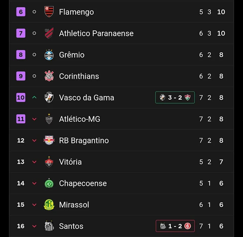 There was also a change at the bottom, with Cruzeiro returning to the 20th position.