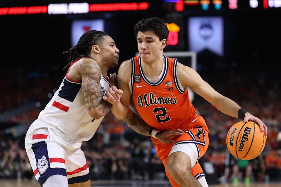 Andrej Stojakovic #2 of the Illinois Fighting Illini drives to the basket against Solo Ball #1 of the UConn Huskies in the first half of the Final Four of the 2026 NCAA Men’s Basketball Tournament at Lucas Oil Stadium on April 04, 2026 in Indianapolis, Indiana.