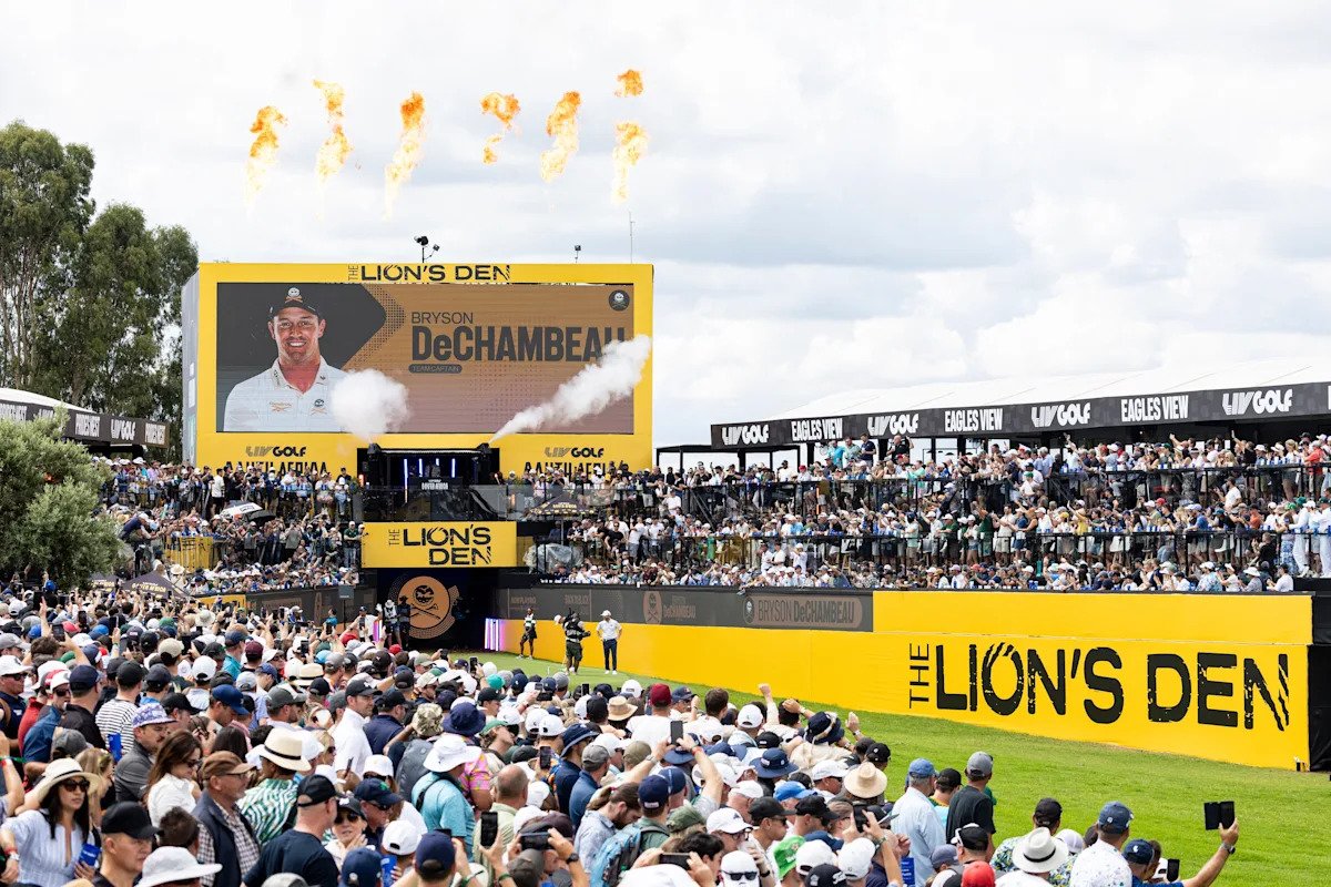Captain Bryson DeChambeau of Crushers GC is introduced at the Lion’s Den at the 17th tee during the third round of LIV Golf South Africa at The Club at Steyn City on Saturday, March 21, 2026 in Midrand, South Africa. (Photo by Jon Ferrey/LIV Golf)