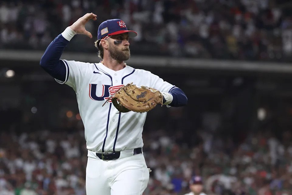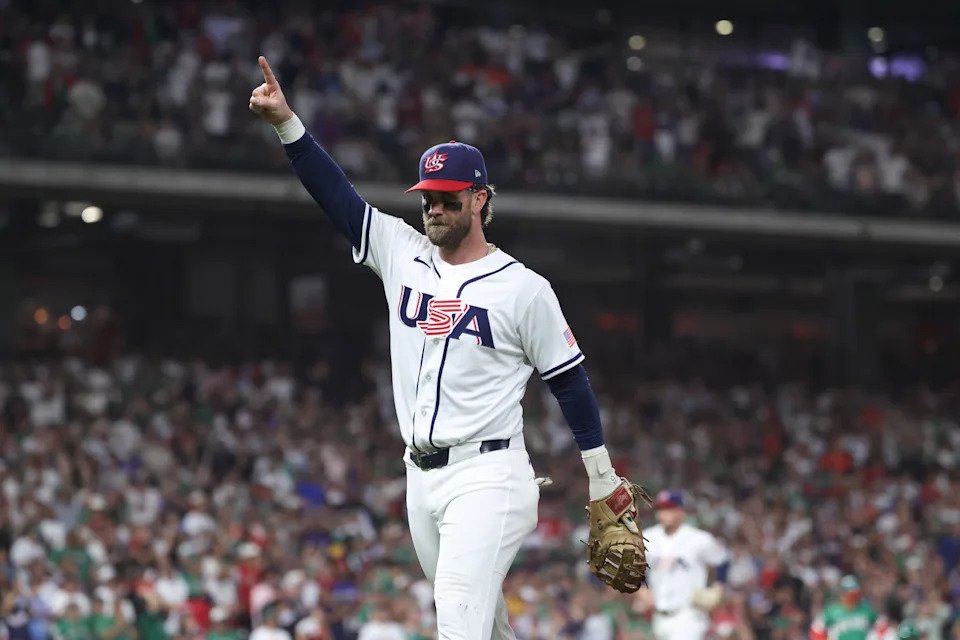 United States infielder Bryce Harper (24) reacts in the third inning against Mexico at Daikin Park.