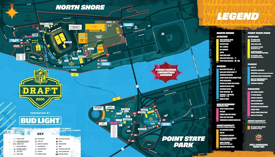 Pittsburgh has split their draft festivities among two locations: the North Shore area (where the Steelers play) and Point State Park across the river. Fans will have to enter threw security at each location. To get from one part to the other, they’ll have to walk to the Roberto Clemente Bridge, passing by PNC Park. On Friday and Saturday, a ferry will be available to transport fans across the river.