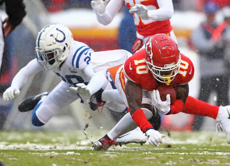 Jan. 12, 2019: Kansas City Chiefs wide receiver Tyreek Hill dives for more yardage during an AFC divisional playoff game against the Indianapolis Colts at Arrowhead Stadium. The Chiefs won the game, 31-13, for the team’s first home playoff win in 25 years.