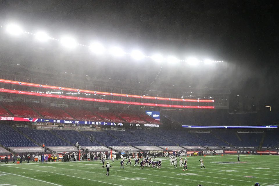 Nov. 15, 2020: Rain falls during the game between the New England Patriots and Baltimore Ravens at Gillette Stadium. The Patriots won the game, 23-17.