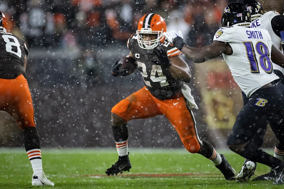 Dec. 17, 2022: Cleveland Browns running back Nick Chubb (24) runs the ball against the Baltimore Ravens as snow falls during the fourth quarter at FirstEnergy Stadium. The Browns won the game, 13-3.