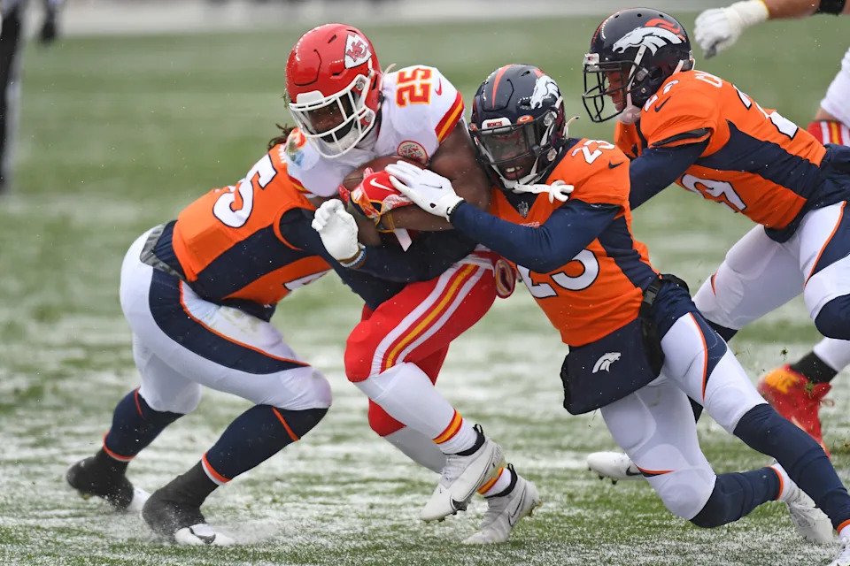 Oct. 25, 2020: Kansas City Chiefs running back Clyde Edwards-Helaire (25) rushes for a touchdown against the Denver Broncos at Empower Field at Mile High. The Chiefs won the game, 43-16.