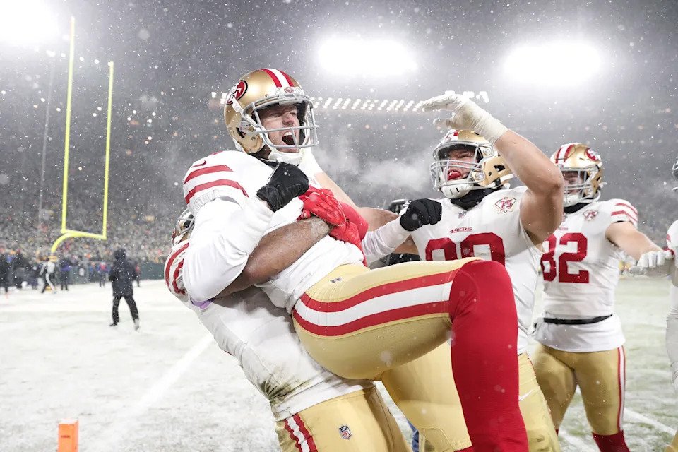 Jan. 22, 2022: San Francisco 49ers kicker Robbie Gould celebrates with teammate after kicking the game-winning field goal during the NFC divisional playoff game against the Green Bay Packers at cold and snowy Lambeau Field.
