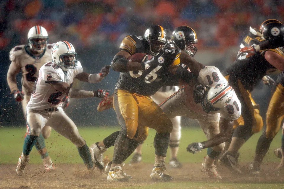 Sept. 26, 2004: Pittsburgh Steelers running back Jerome Bettis (36) is tackled by the Miami Dolphins’ Jay Williams (91). The playing conditions were tough because of Hurricane Jeanne. The Steelers won the game, 13-3.