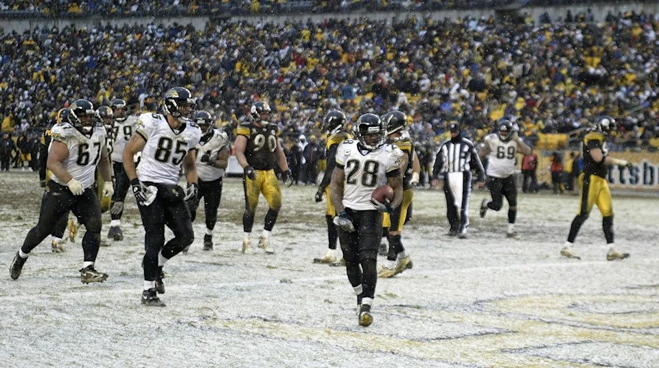 Dec. 16, 2007: Jacksonville Jaguars running back Fred Taylor walks into the end zone after scoring the winning touchdown against the Pittsburgh Steelers at Heinz Field. The Jaguars won the game, 29-22.