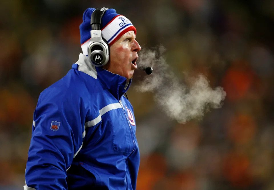 Jan 20, 2008: New York Giants head coach Tom Coughlin shouts to his team from the sidelines during the second quarter of the 2007 NFC Championship Game at Lambeau FIeld. The Giants beat the Packers, 23-20, in overtime.