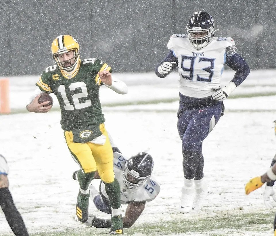 Dec. 27, 2020: Green Bay Packers quarterback Aaron Rodgers scrambles for a first down before being tackled by Tennessee Titans linebacker Rashaan Evans in the first quarter at Lambeau Field.