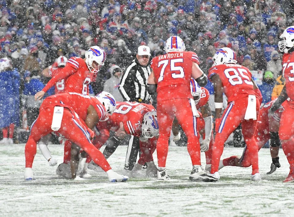 Dec. 1, 2024: Buffalo Bills quarterback Josh Allen (17) calls signals during a “Sunday Night Football” game against the San Francisco 49ers at Highmark Stadium. The Bills won the snow-covered game, 35-10, to clinch the AFC East division title for a fifth consecutive season.