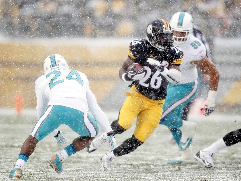 Dec. 8, 2013: Pittsburgh Steelers running back Le’Veon Bell carries the ball as Miami Dolphins cornerback Dimitri Patterson (24) and defensive tackle Jared Odrick (98) pursue during the first quarter at Heinz Field. The Dolphins won the game, 34-28.