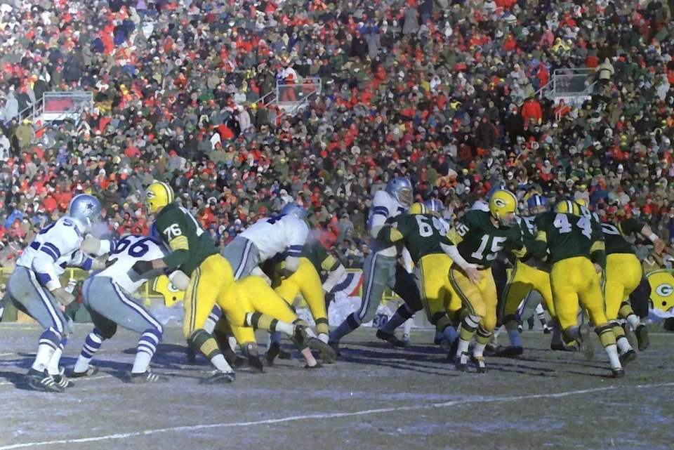 Dec. 31, 1967: Green Bay Packers quarterback Bart Starr (15) hands off to running back Donny Anderson (44) during the NFL championship game against the Dallas Cowboys at Lambeau Field. The Packers defeated the Dallas Cowboys, 21-17. At minus-13 degrees, with a minus-48 wind chill, the “Ice Bowl” remains the NFL’s coldest game ever.
