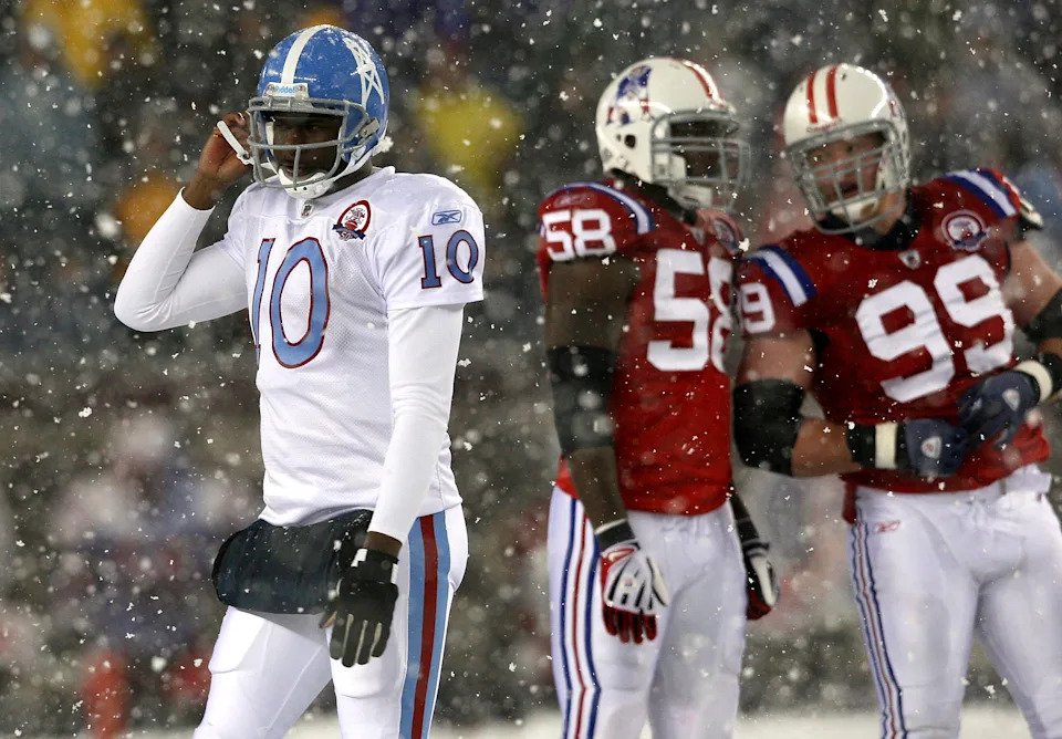 Oct. 18, 2009: Vince Young of the Tennessee Titans — dressed in the uniforms of the Houston Oilers — leaves the field as the New England Patriots’ Pierre Woods (58) and Mike Wright (99) converse at Gillette Stadium. The Patriots won the game, 59-0.
