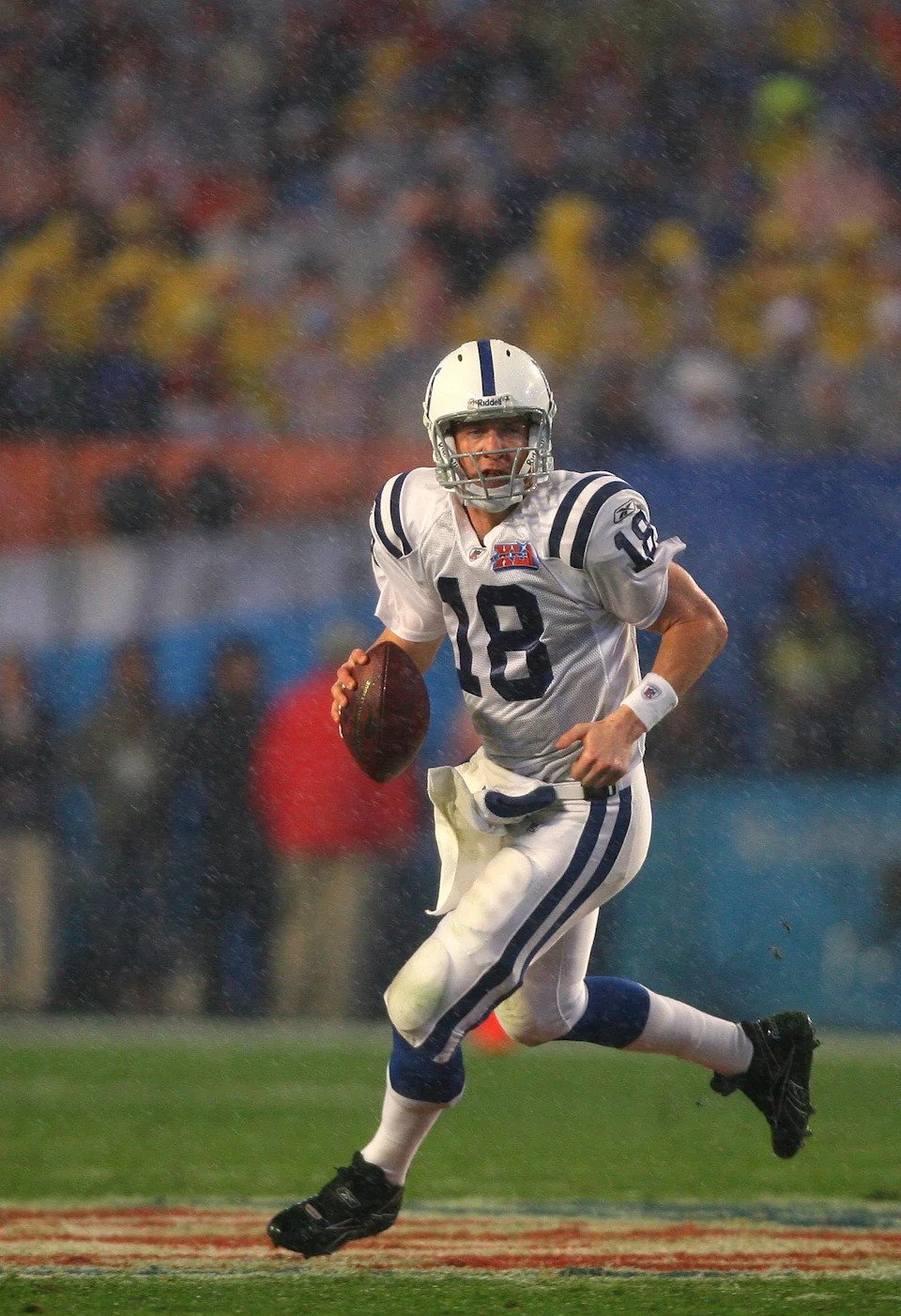 Feb. 4, 2007: Indianapolis Colts quarterback Peyton Manning scrambles out of the pocket against the Chicago Bears during Super Bowl XLI at Dolphins Stadium. The Colts won the game, 29-17, in the first Super Bowl played in the rain.