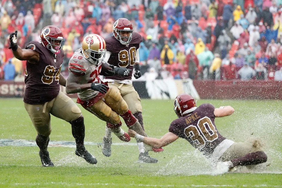 Oct. 20, 2019: San Francisco 49ers running back Tevin Coleman (26) is tackled by Washington Redskins defensive back Troy Apke (30) while carrying the ball at FedExField. The 49ers won the game, 9-0.