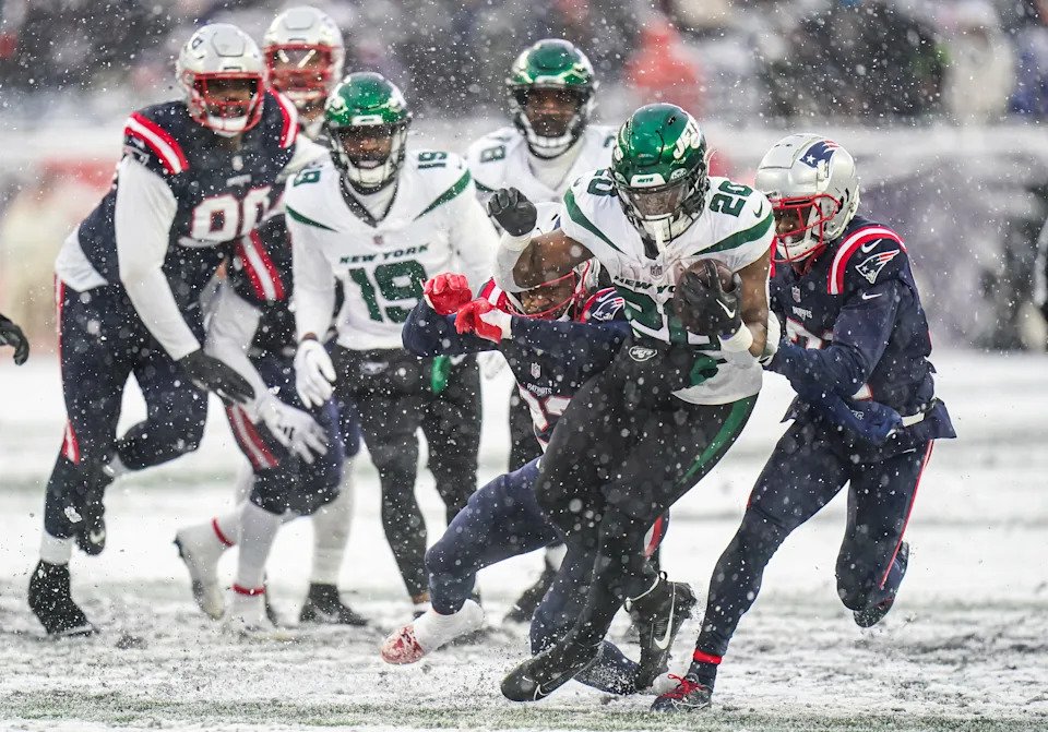 Jan. 7, 2024: New York Jets running back Breece Hall (20) runs the ball against the New England Patriots at snowy Gillette Stadium. The Jets won the game, 17-3.