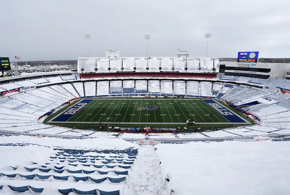 Jan. 15, 2024: Snow covers Highmark Stadium before the AFC wild-card playoff game between the Pittsburgh Steelers and Buffalo Bills. The Bills won the game, 31-17, after the contest was postponed a day due to a massive winter storm.