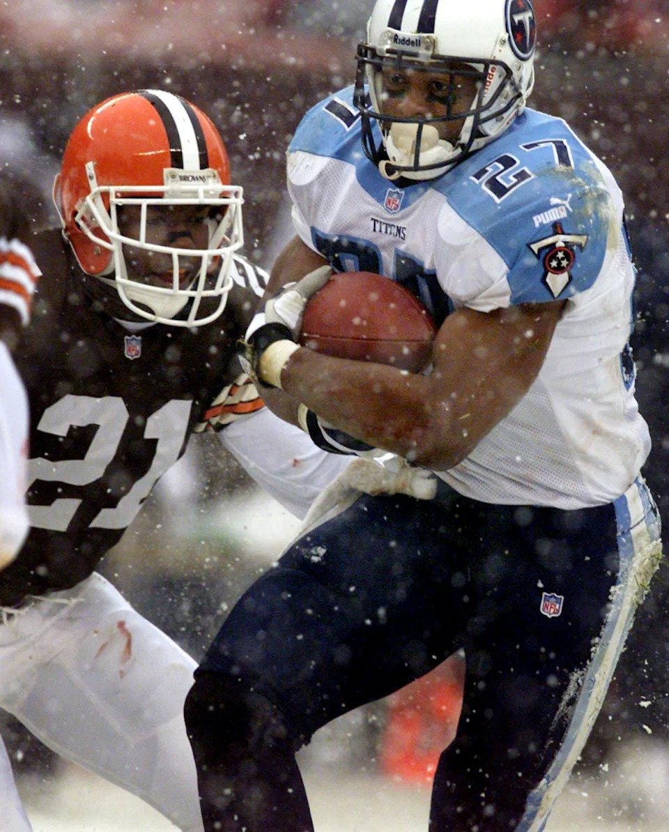 Dec. 17, 2000: Tennessee Titans running back Eddie George attempts to move away from Cleveland Browns defender Marquis Smith (21) at Cleveland Browns Stadium. The Titans won, 24-9, with George gaining 176 rushing yards on 34 carries and three touchdowns.