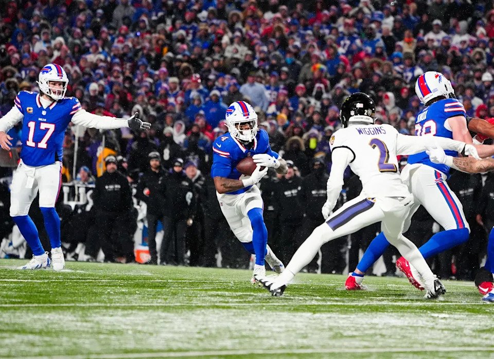 Jan. 19, 2025: Buffalo Bills running back James Cook (4) runs the ball against the Baltimore Ravens during an AFC divisional playoff game. The Bills won the game, 27-25, in snowy and chilly conditions at Highmark Stadium.
